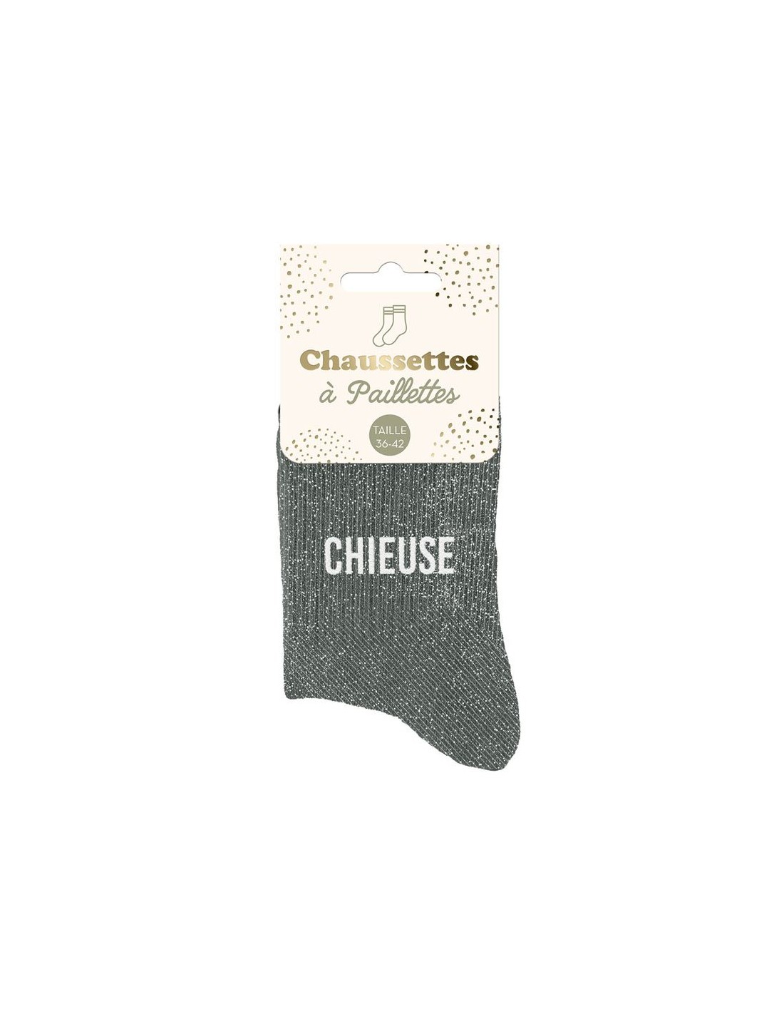 Chaussettes grises à paillettes avec la mention "Chieuse" en blanc