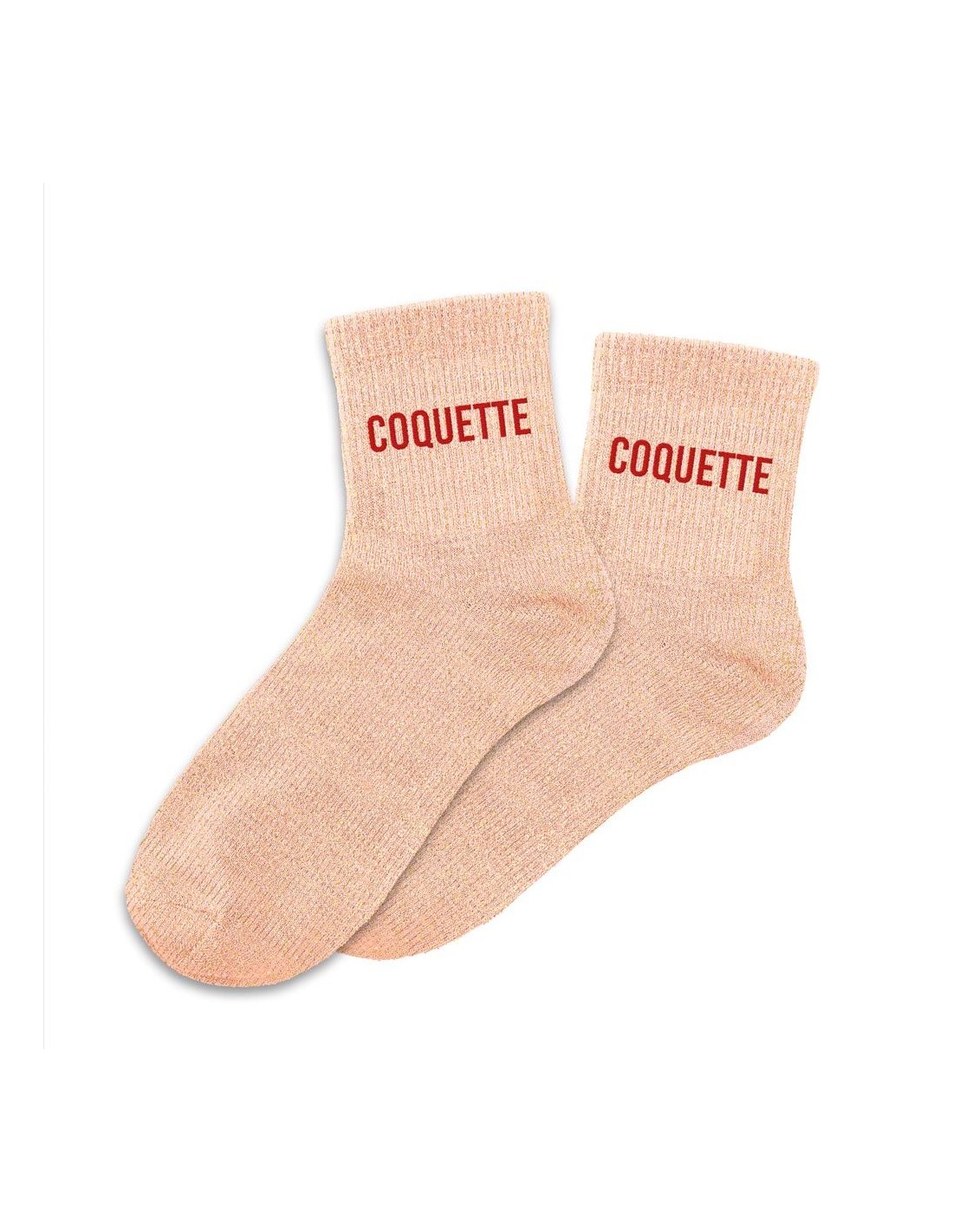 Ces chaussettes saumon à paillettes avec la mention "COQUETTE" en rouge sont la garantie de passer un hiver avec style bien au chaud.