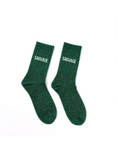 Chaussettes vertes pailletées avec inscription « SAUVAGE » blanche. Brillantes, confortables et pleines de caractère, elles ajoutent une touche audacieuse et stylée à toutes vos tenues.
