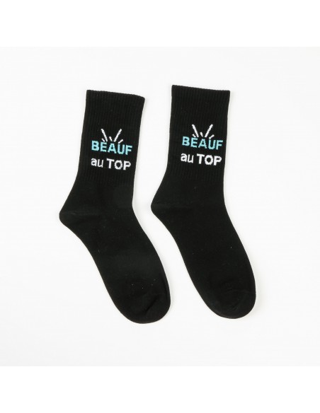 À la recherche d'une paire de chaussettes originale et humoristique qui tient au chaud ? Notre paire de chaussettes "BEAUF AU TOP" est la paire idéale !