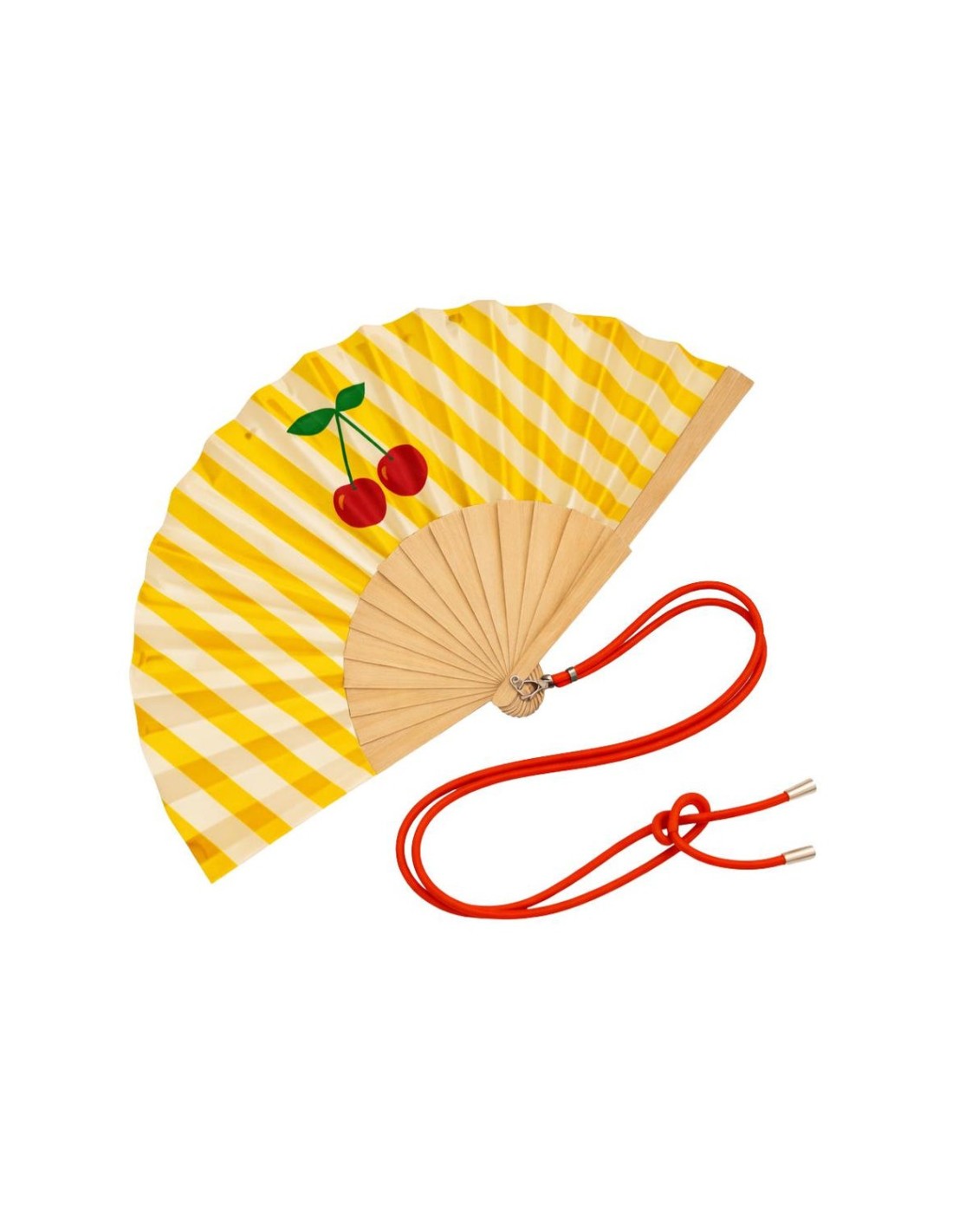 Avec son motif cerises iconique et ses rayures jaunes lumineuses, cet éventail apporte une touche joyeuse, rétro et résolument estivale.