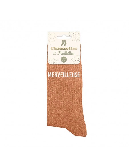 Chaussettes couleur saumon à paillettes avec la mention "Merveilleuse" en blanc.