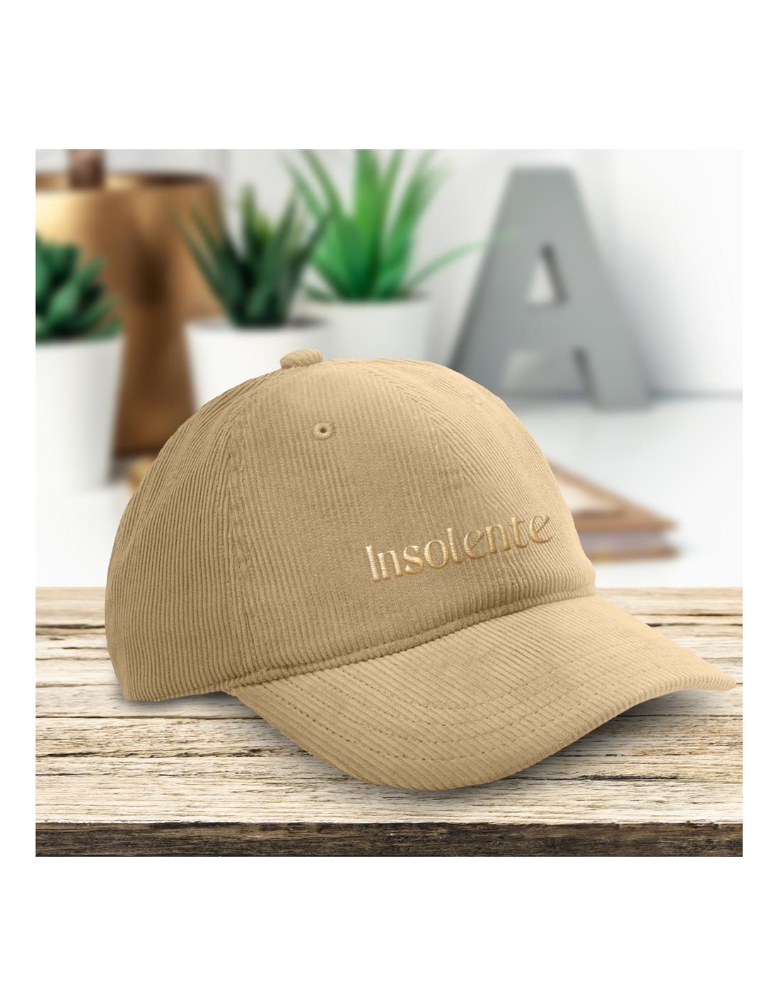 La casquette est en velours côtelé beige avec la mention "Insolente" sur l'avant en doré.