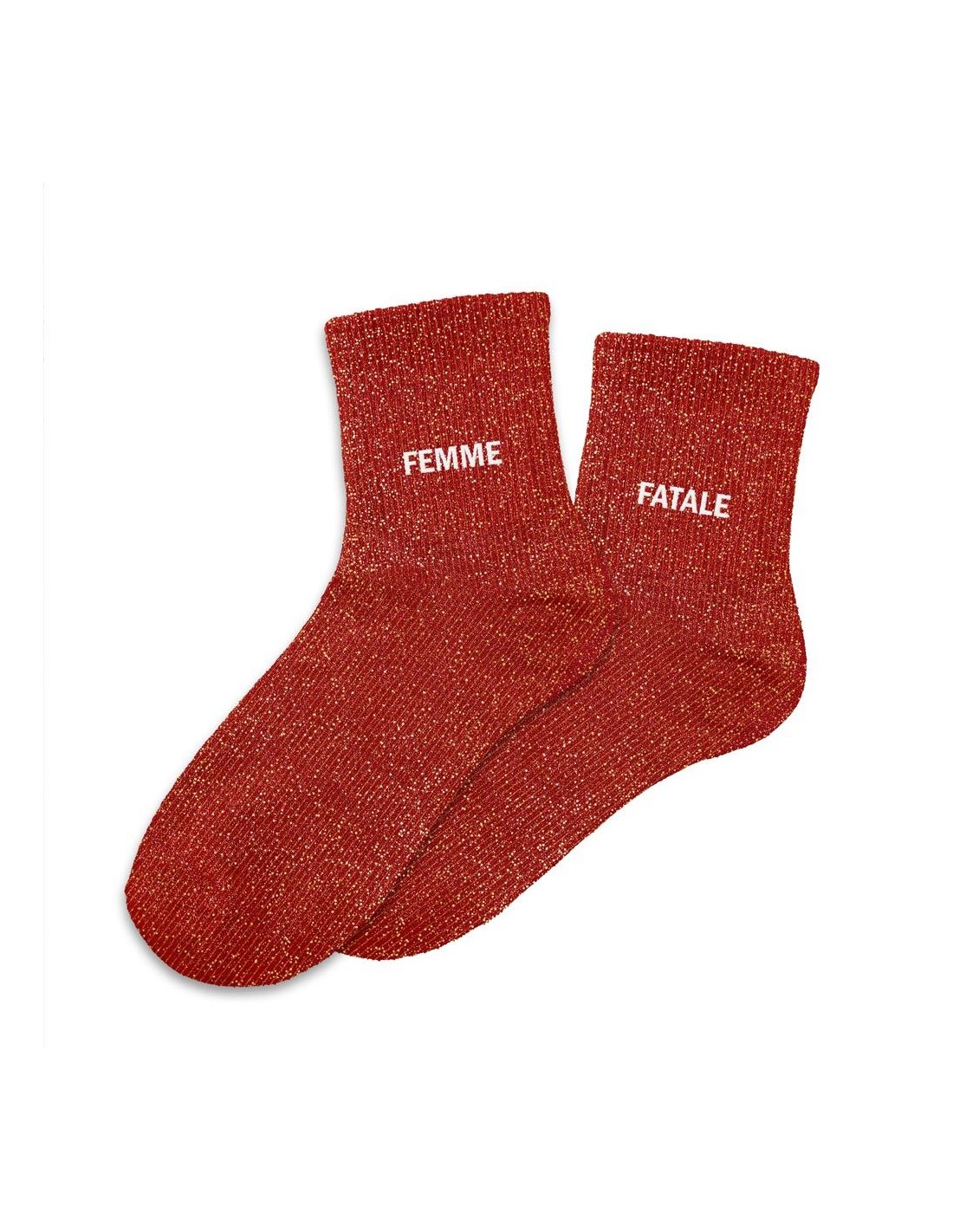 Ces chaussettes dépareillées rouges à paillettes avec les mentions "Femmes" et "Fatale" en blanc sont la garantie de passer un hiver avec style bien au chaud.
