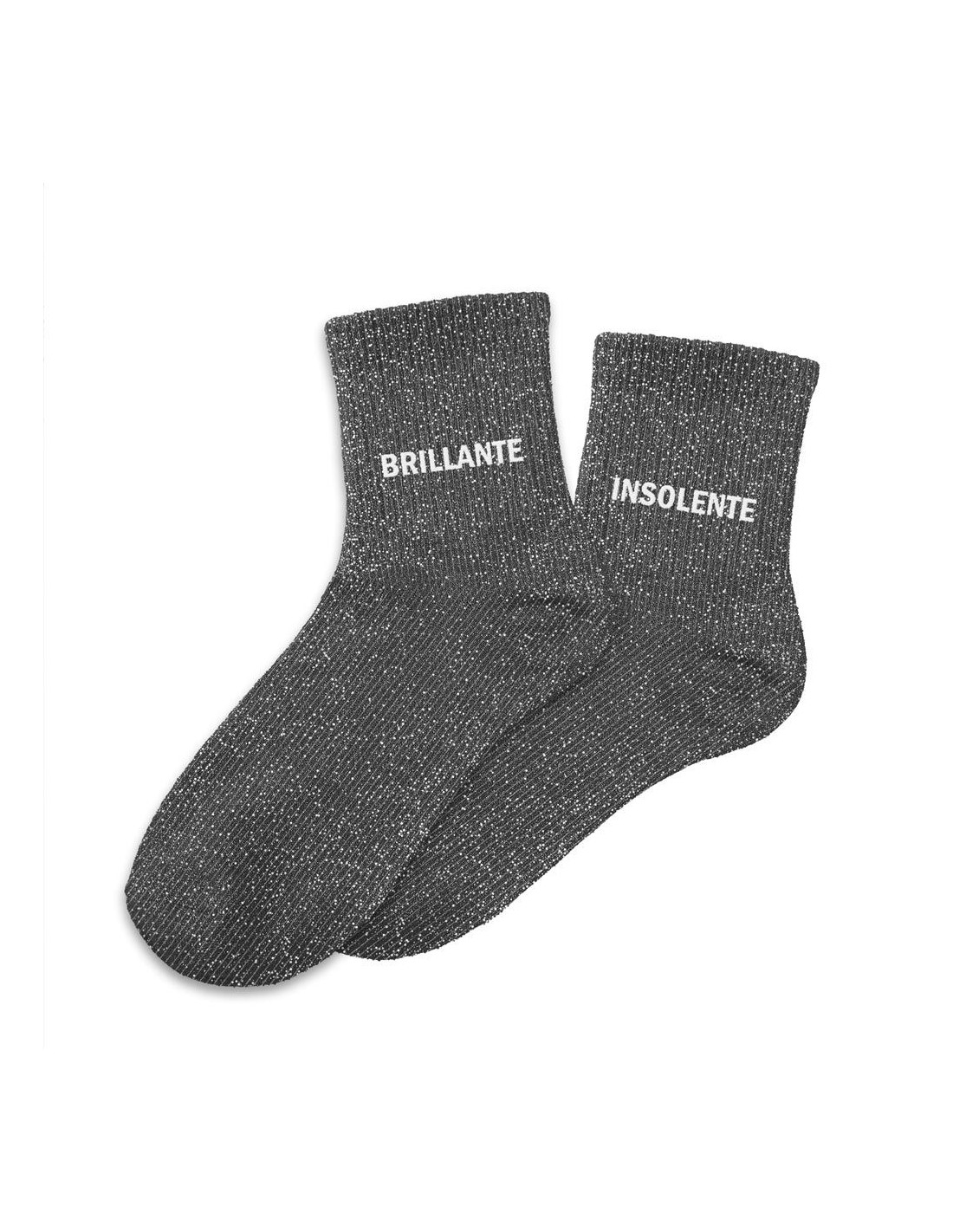 Ces chaussettes dépareillées noires à paillettes avec les mentions "Brillante" et "Insolente" en blanc sont la garantie de passer un hiver avec style bien au chaud.