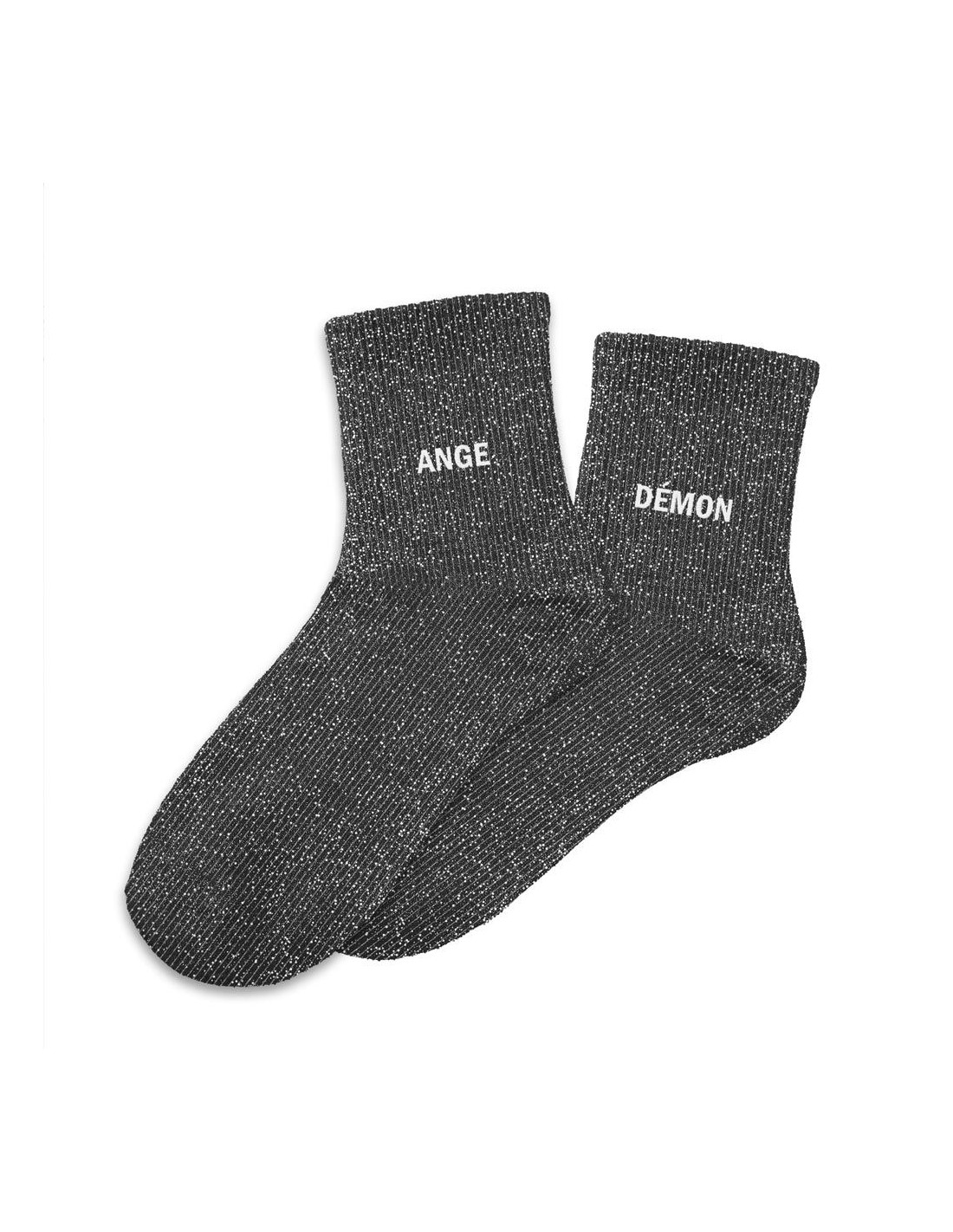 Ces chaussettes dépareillées noires à paillettes avec les mentions "Ange" et "Démon" en blanc sont la garantie de passer un hiver avec style bien au chaud.