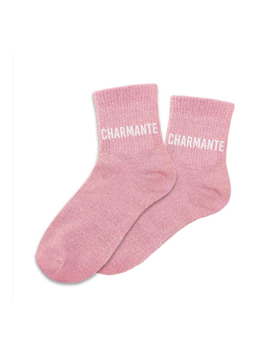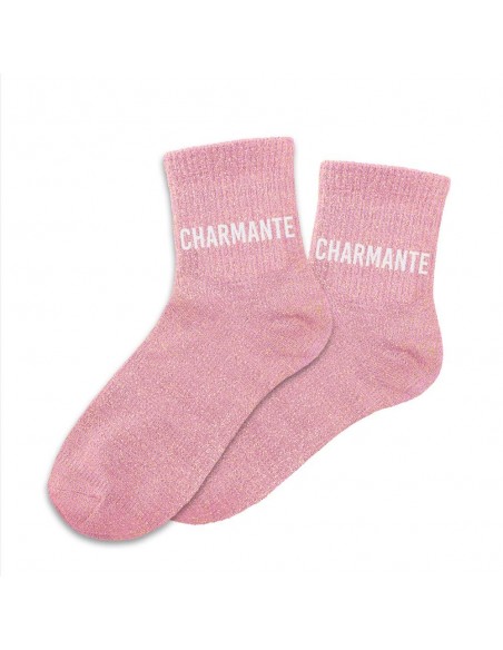 Ces chaussettes roses à paillettes avec la mention "CHARMANTE" en blanc sont la garantie de passer un hiver avec style bien au chaud.