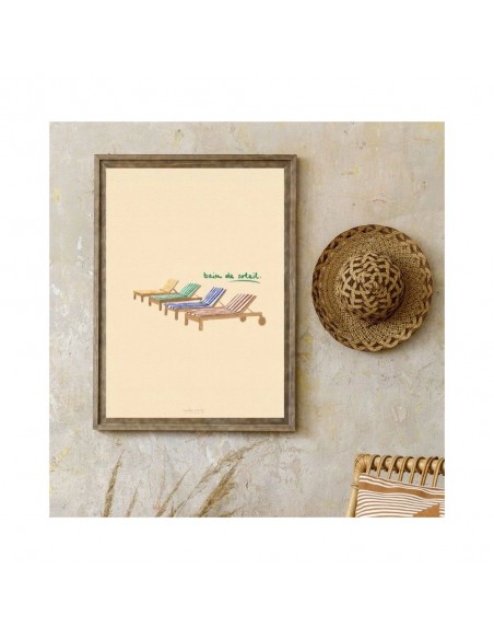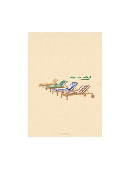 Affiche de quatre transats rayés jaune, vert, bleu et orange, sur un fond beige, avec le texte "bain de soleil". Illuminez votre espace de vie et profitez du confort avec style.