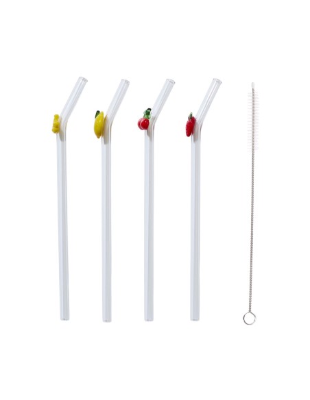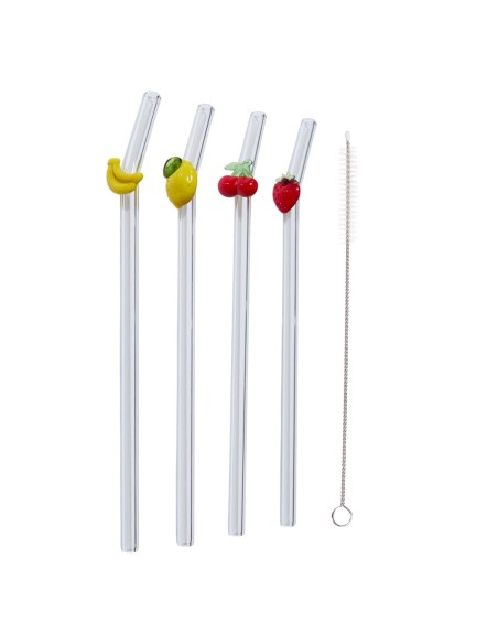Apportez une touche originale à vos boissons avec ce set de 4 pailles en verre décorées de fruits. Réutilisables et vendues avec un goupillon, elles allient style et praticité.