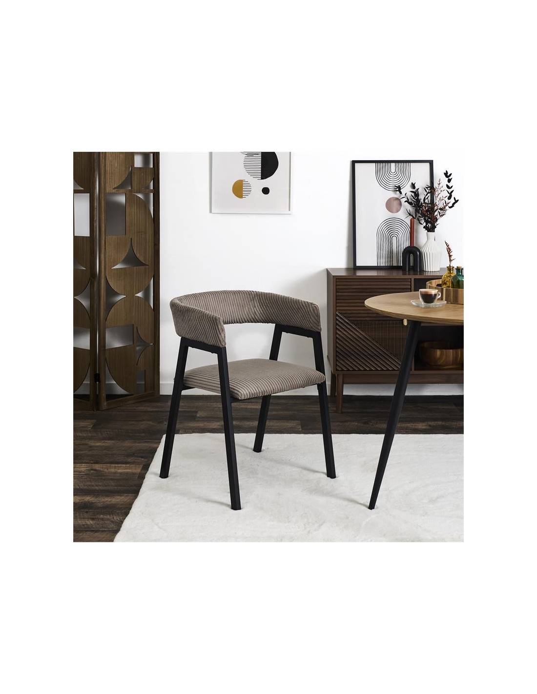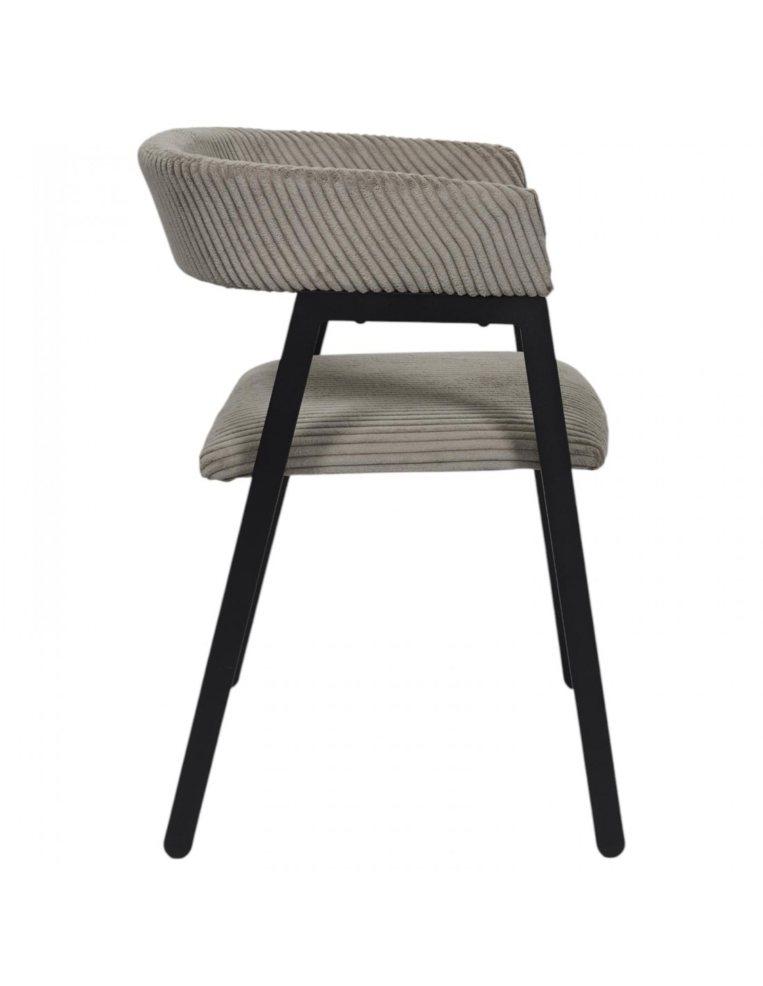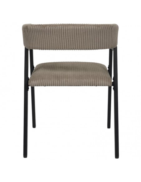 Cette chaise au revêtement en velours côtelé taupe apporte une touche douce et contemporaine à votre déco. Son assise rembourrée et son dossier enveloppant assurent un excellent confort, tandis que sa structure noire souligne son élégance. Un parfait équilibre entre style sobre et design tendance !