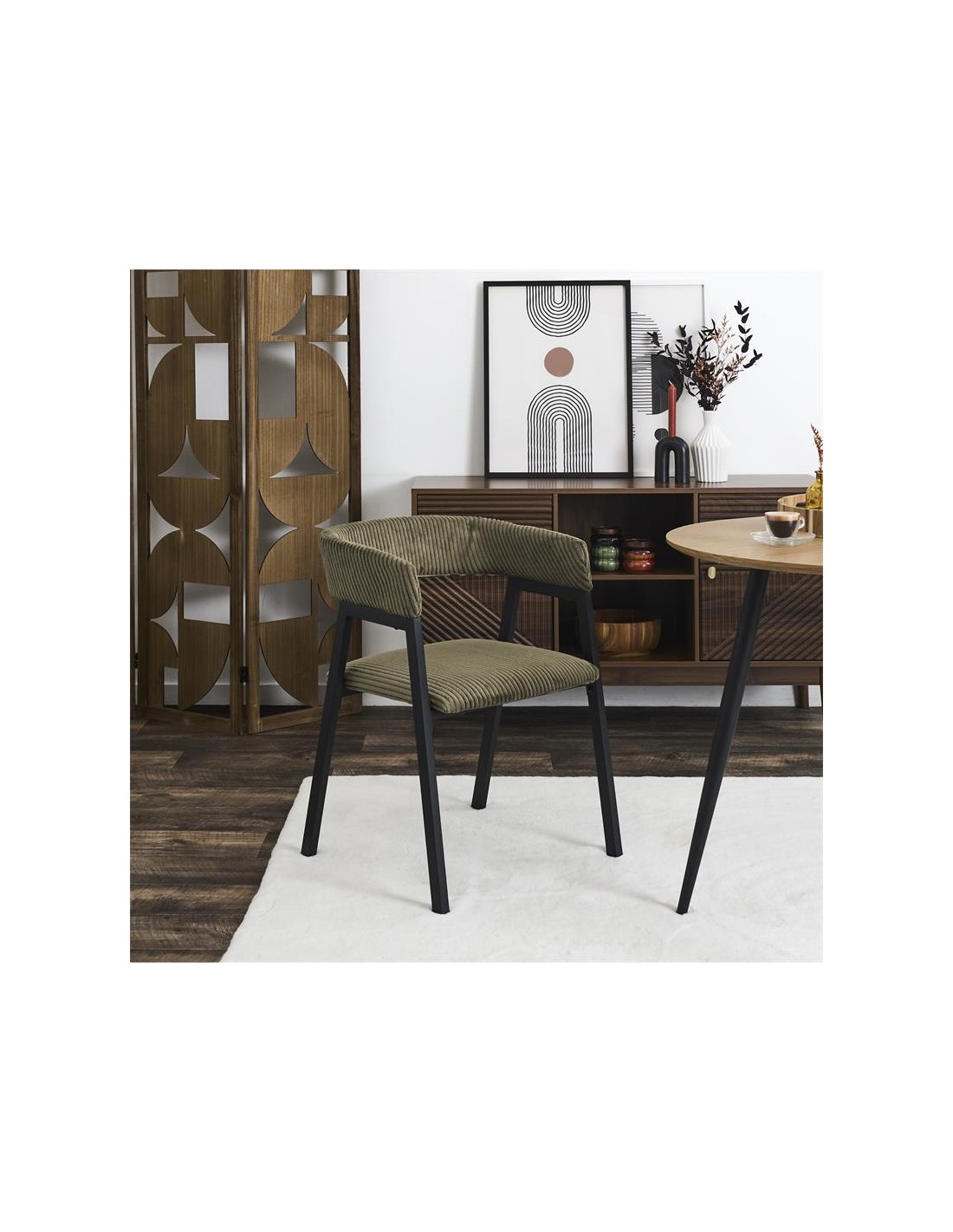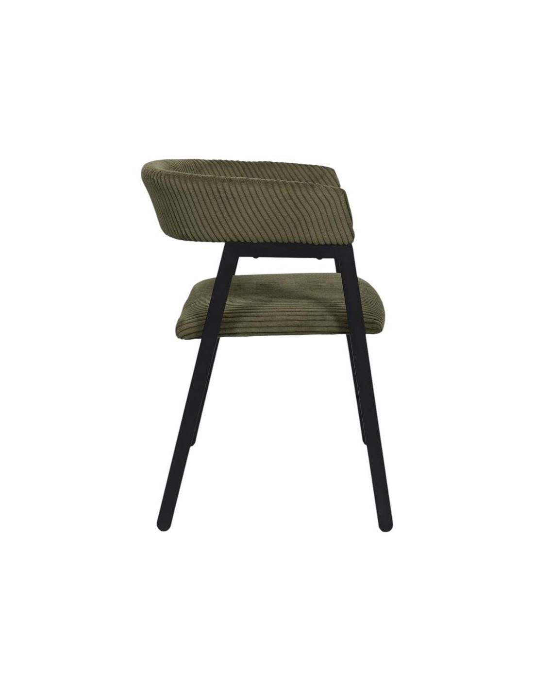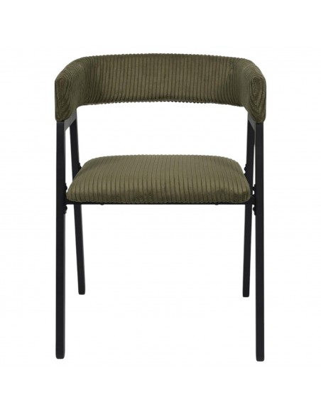 Cette chaise allie l’élégance d’un velours côtelé vert kaki à la sobriété d’une structure noire moderne. Sa forme enveloppante et son assise généreusement rembourrée offrent un confort optimal pour vos repas ou moments de détente. Idéale pour ajouter une touche de caractère à une salle à manger ou un bureau.