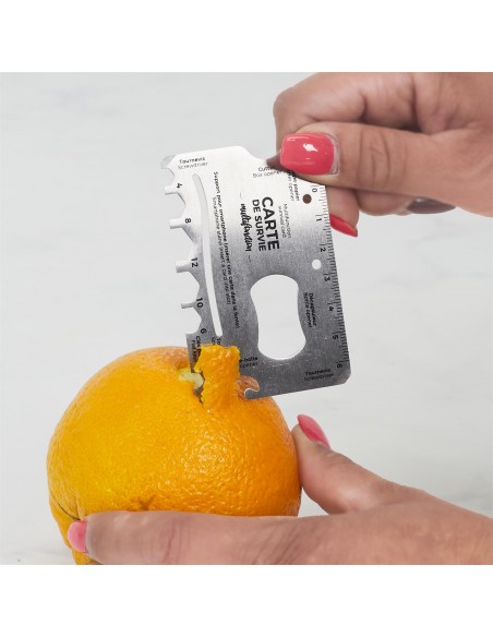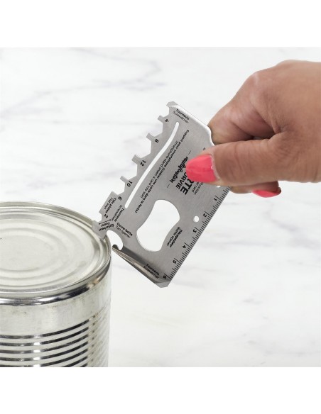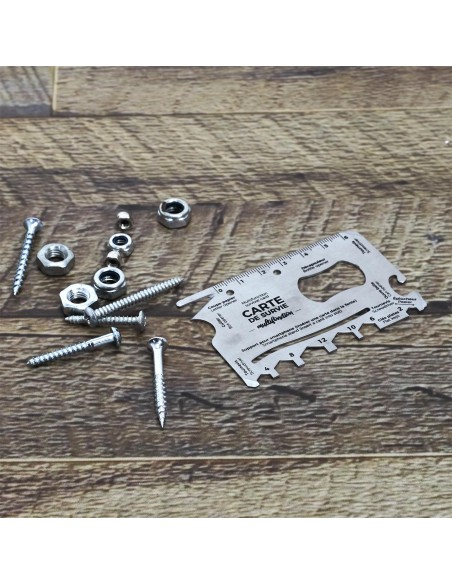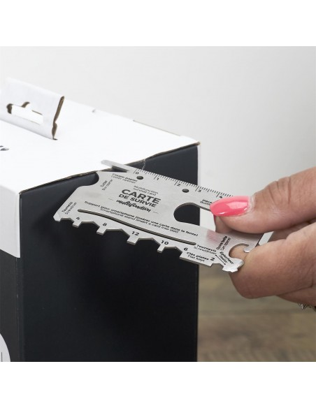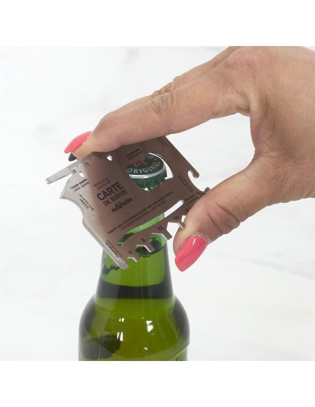 Cette carte métallique multifonctions présente plusieurs options : ouvre-lettre, décapsuleur, ouvre-colis, ouvre-boîte, clés et tournevis !