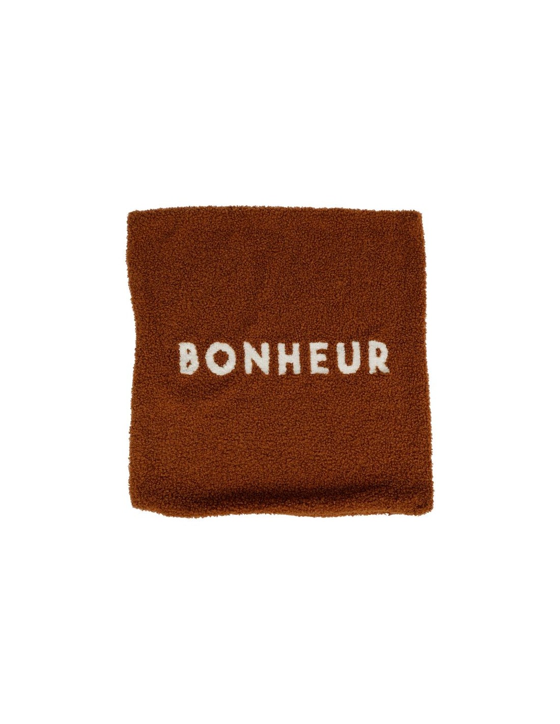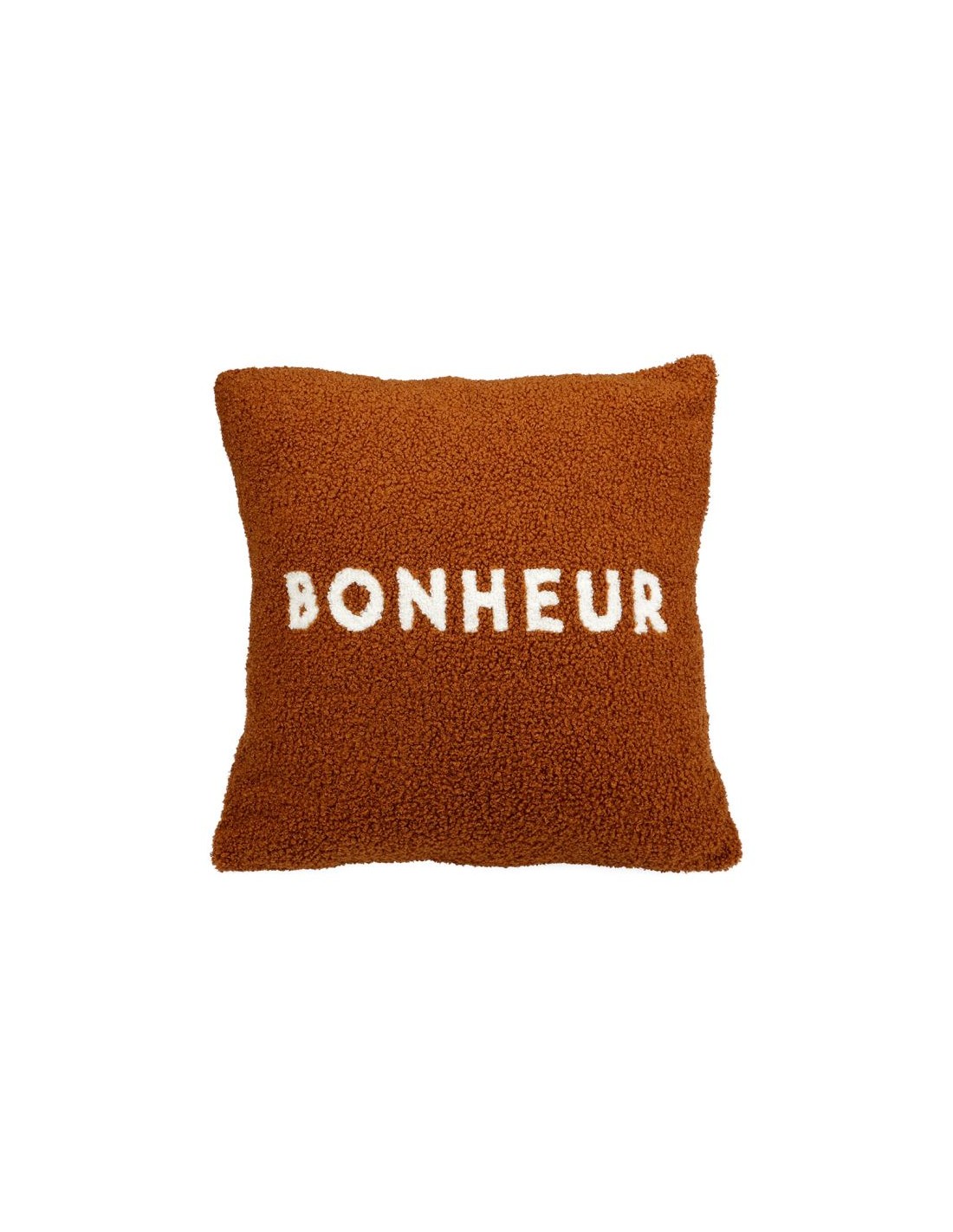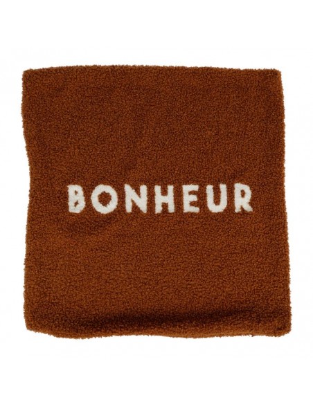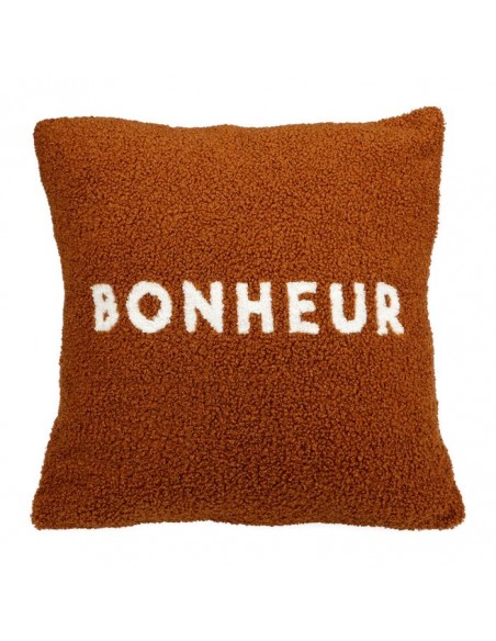 Housse de coussin carré avec le mot imprimé "Bonheur" de couleur blanche à bouclettes marron, fermeture à zip.