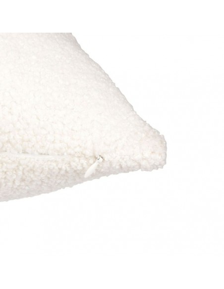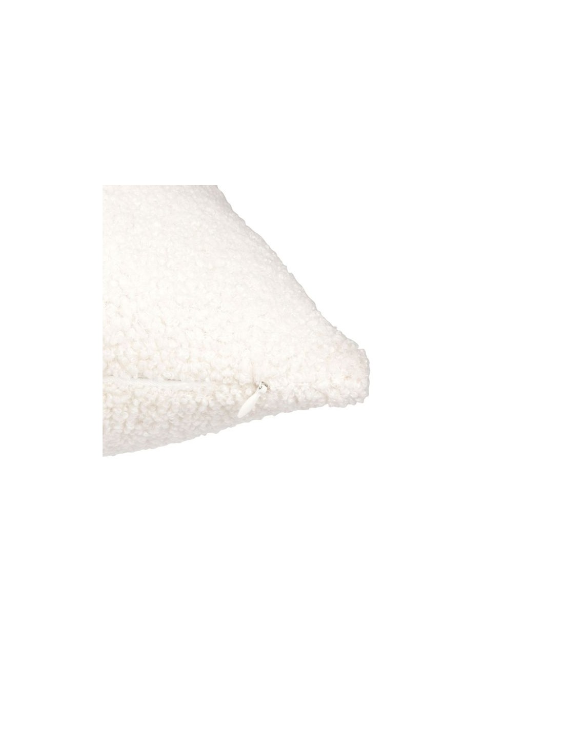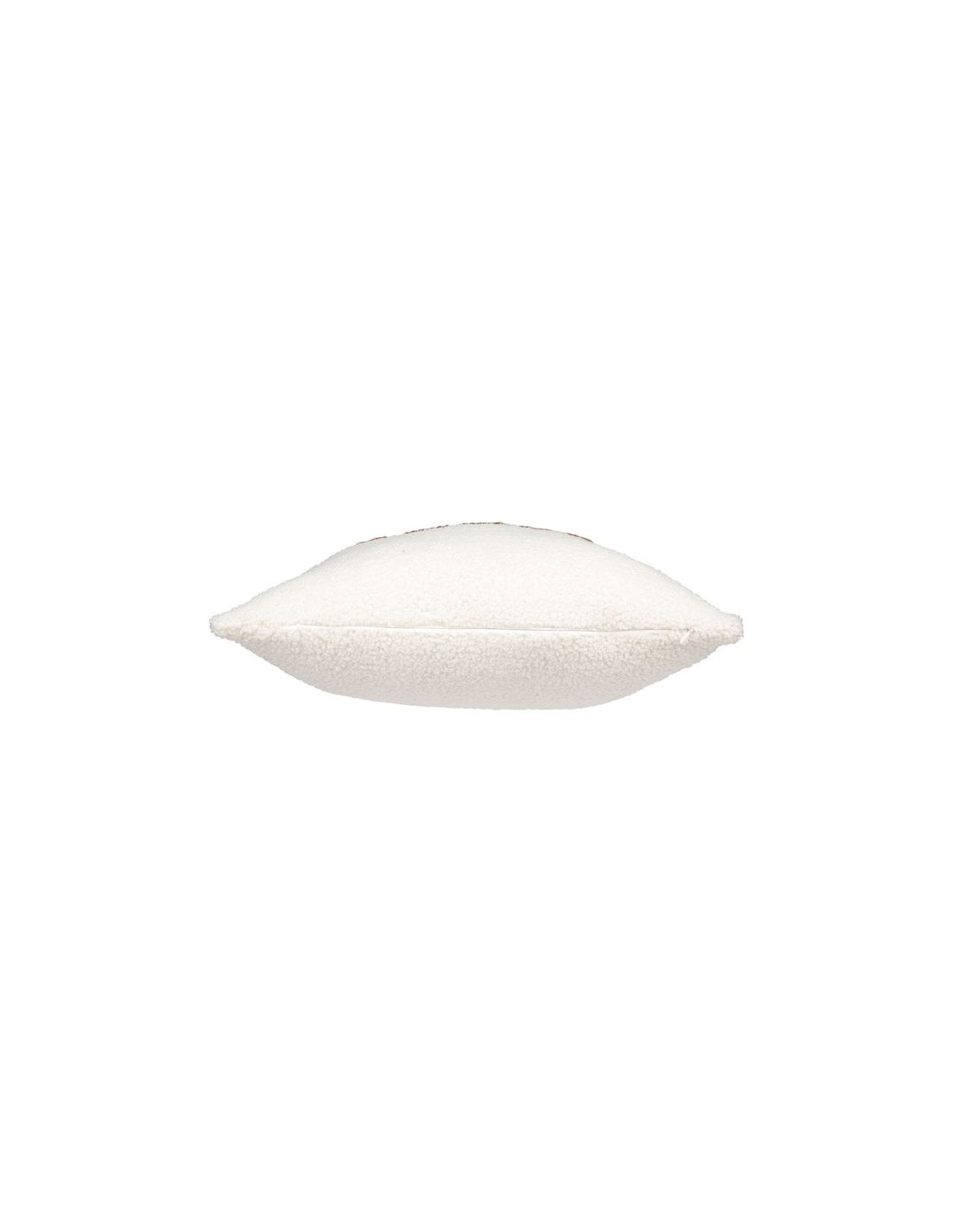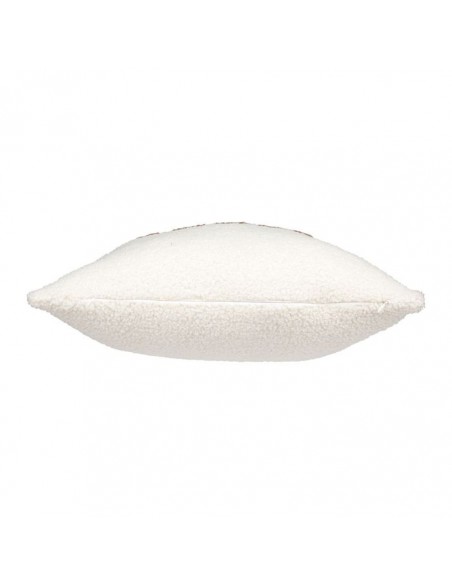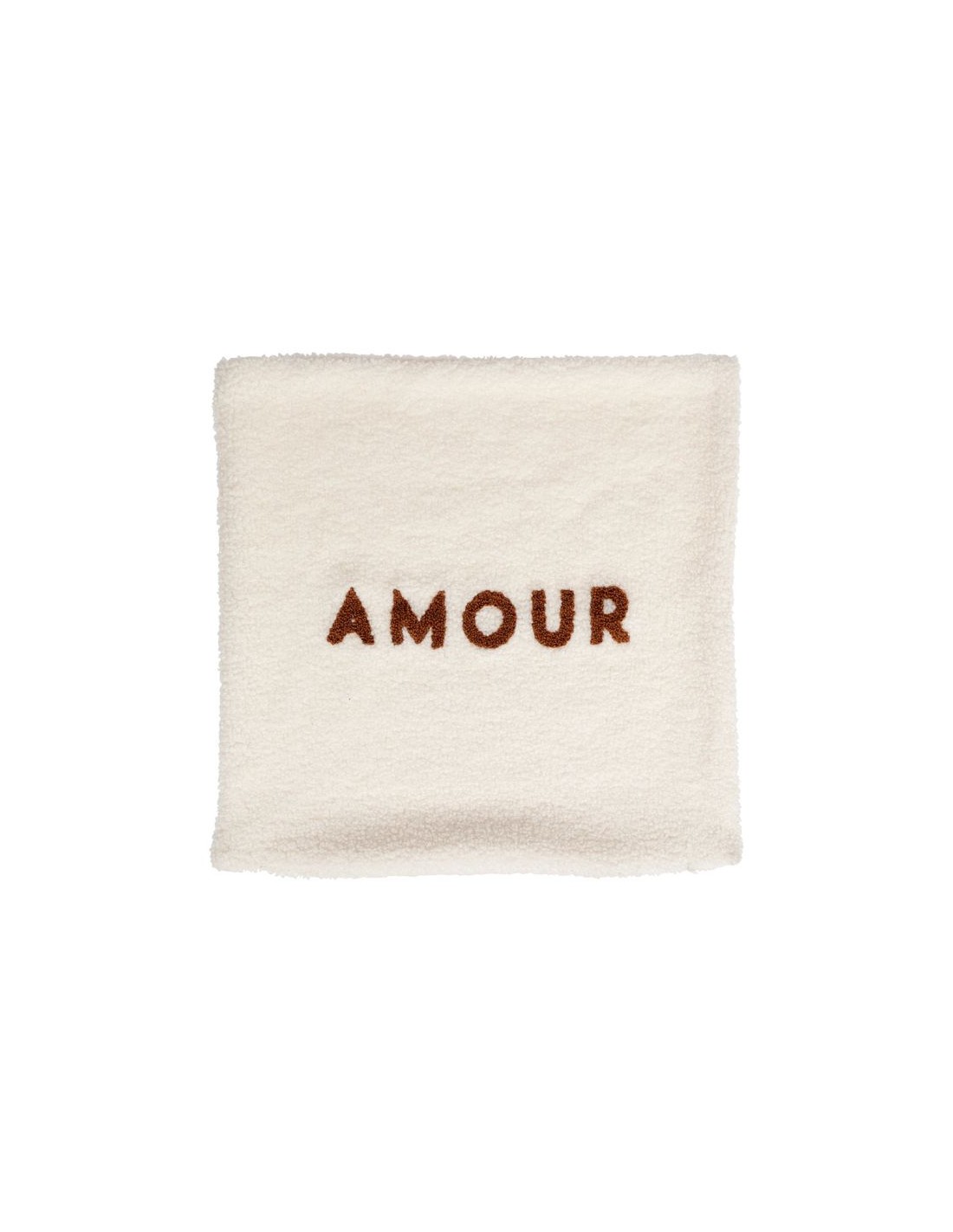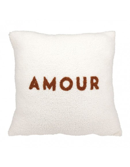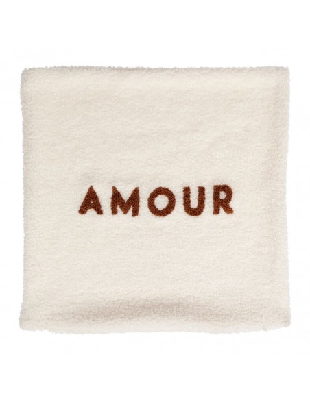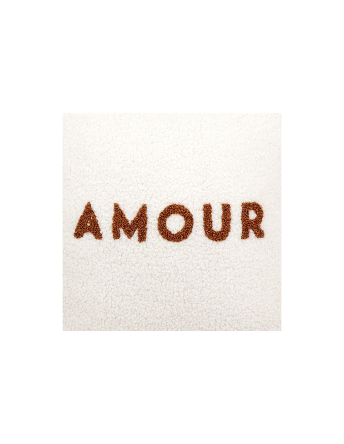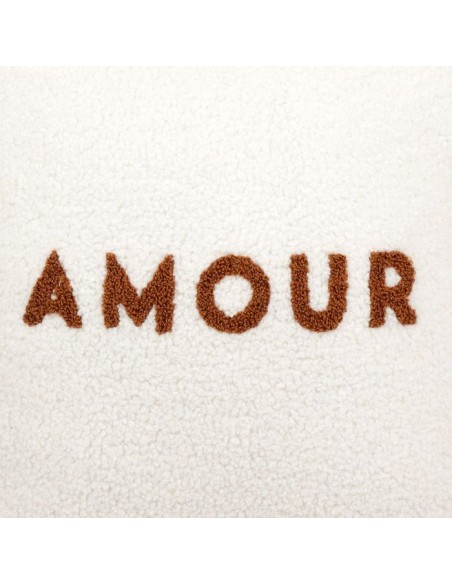 Housse de coussin carré avec le mot "AMOUR" en texturé de couleur marron à bouclettes blanc, fermeture à zip.