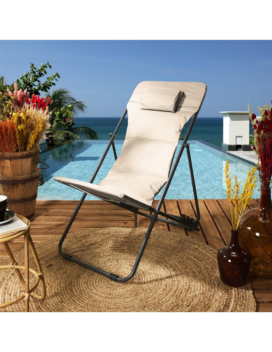 Profitez d'un moment à l'air frais sur ce transat pliant ultra stylé ! Élégant et fonctionnel, ce transat est parfait pour votre jardin, votre terrasse ou même à la plage. Pratique, il se pli et se transporte facilement. Détendez vous en toute tranquillité, vous allez l'adorer !