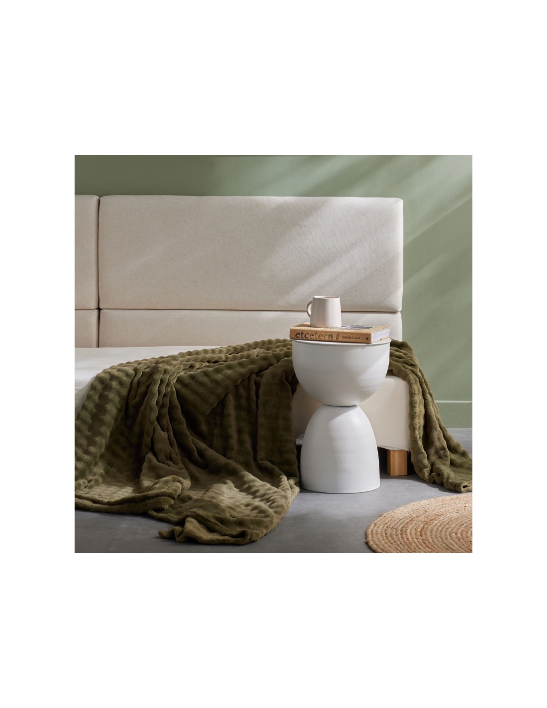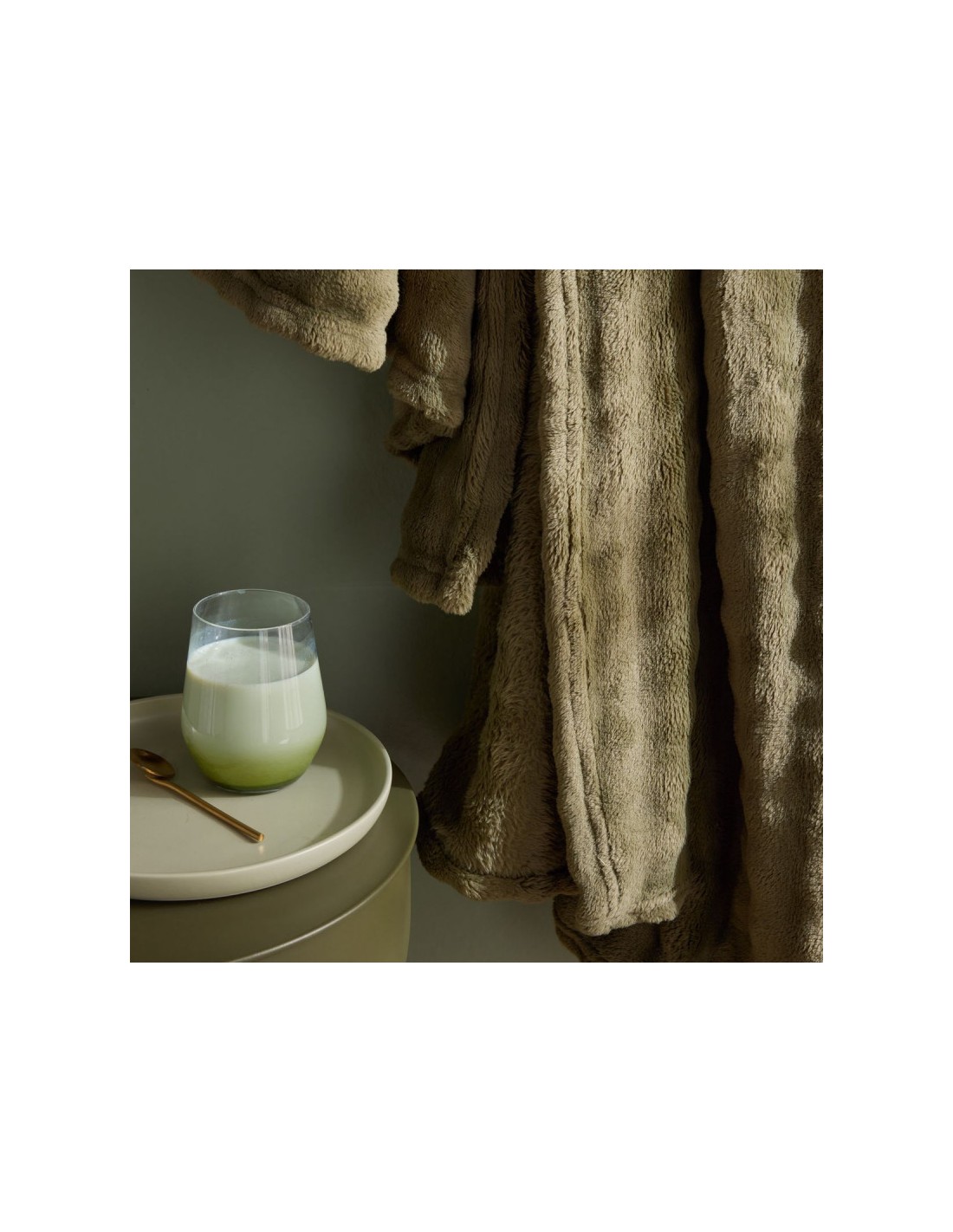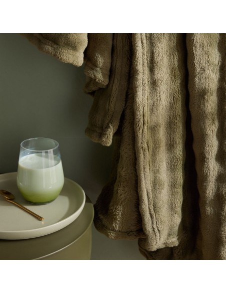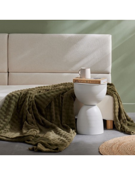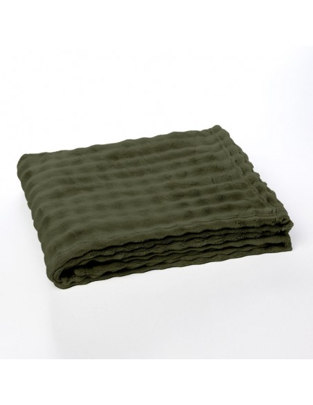 Plaid Matcha en motif damier, coloris vert kaki. Doux, moelleux et texturé, il apporte chaleur et élégance à votre intérieur pour des moments cocooning tout en style.