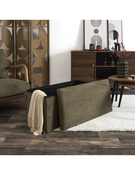Découvrez ce magnifique banc de rangement qui fait également office de banc ! Le modèle est pliable pour s'adapter avec facilité à vos besoins. Son effet côtelé, en plus d'apporter une dimension cocooning à votre intérieur, il ravira les aficionados de douceur !