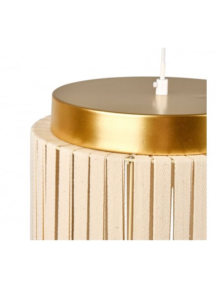 Structure en métal doré pour une finition raffinée, associée à un abat-jour en coton beige qui diffuse une lumière douce et chaleureuse.