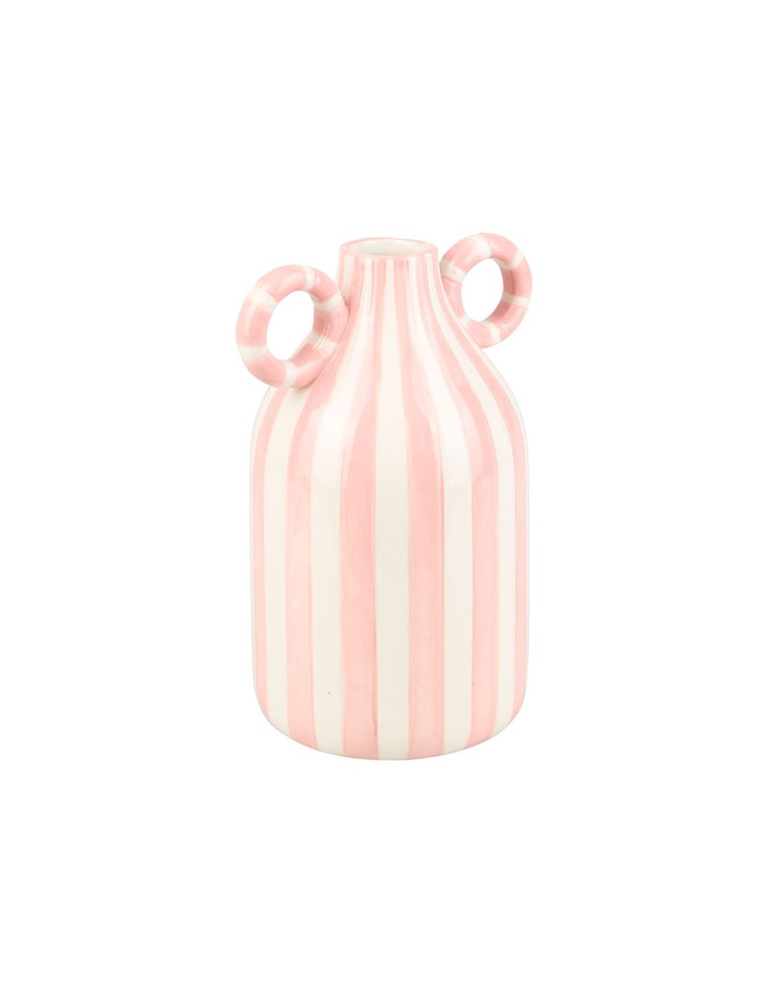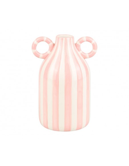 Vase décoratif en céramique aux rayures blanches et roses. Sa forme arrondie à double anse et son design rayé apportent une touche douce et tendance à votre intérieur.